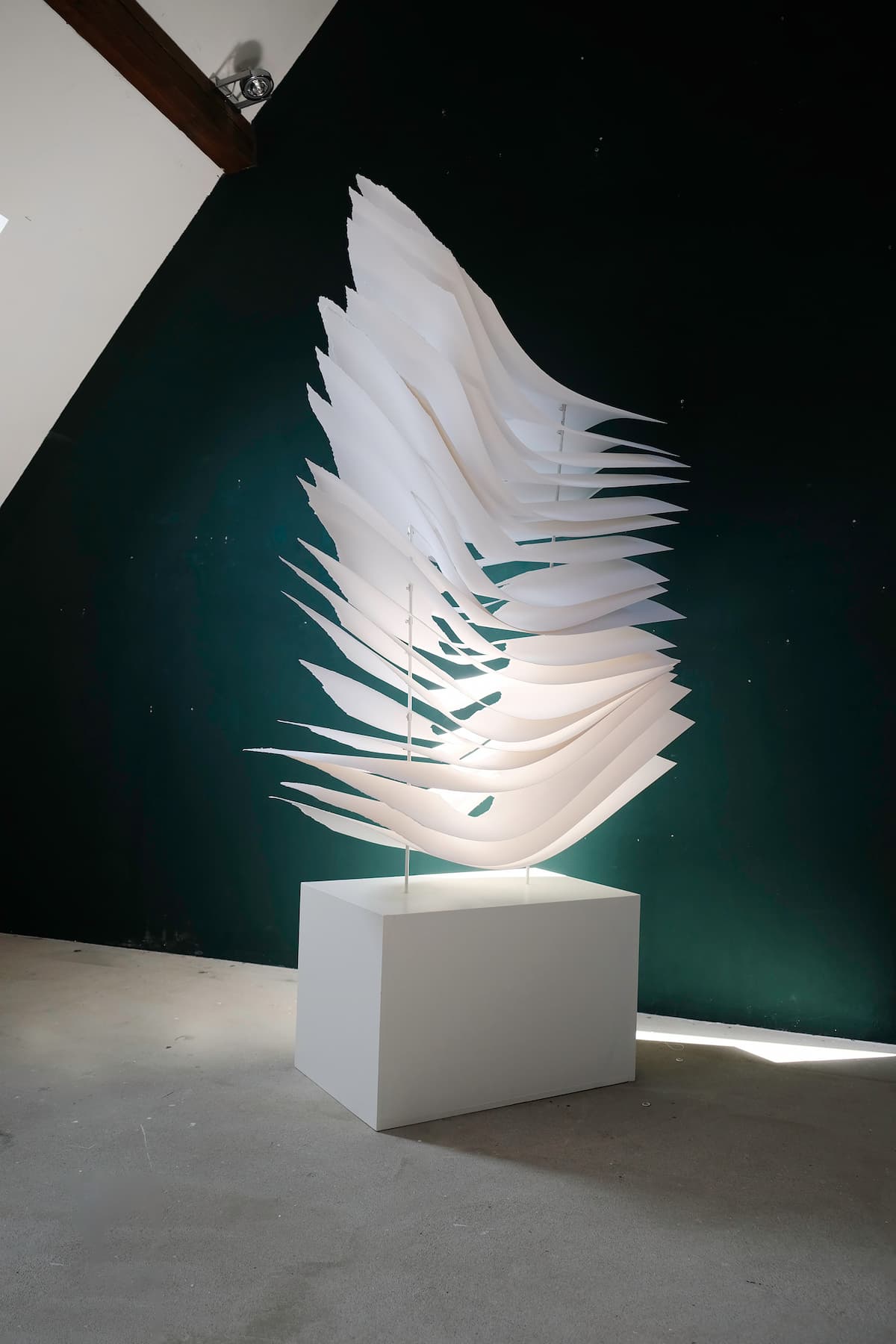 在空間中,《Montcanus》既像瞬間凝固的火山噴發,也如風掠過山脊後留下的動勢痕跡,使觀者在實體物質與自然現象之間產生聯想。透過紙材的脆弱性與光影的強度並置,Glajcar 以最純粹的單色紙創造出強而有力的空間節奏,呈現出介於靜與動、重量與無重之間的詩性狀態。
