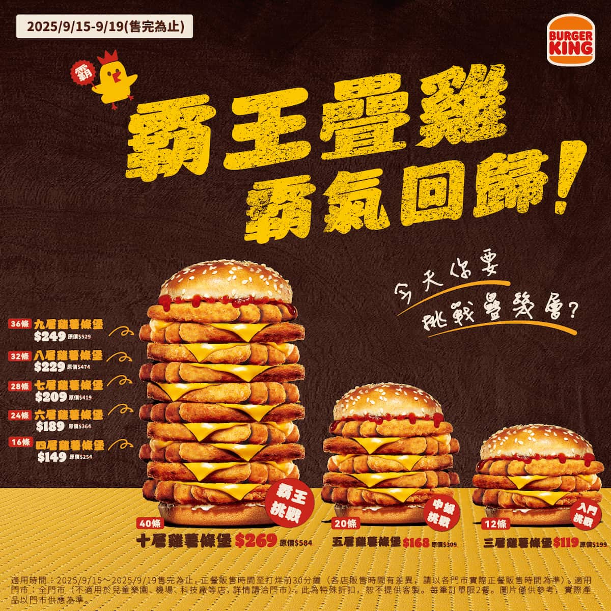 想挑戰「十層霸王疊雞」、體驗視覺與味覺雙重享受的朋友,千萬別錯過9/15-9/19這5天!更多活動詳情、門市查詢與線上訂餐,都可以上漢堡王台灣官方網站:https://www.burgerking.com.tw/ 查詢。
