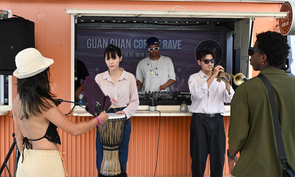 除了音樂,《關關聚揪》也強調咖啡文化。北投在地「大屯火山咖啡」與「大屯菁礐咖啡莊園」進駐快閃店,讓參加者在跳舞同時也能隨手喝到特色手沖。現場還有藝術家張瑞哲的 Live Painting,即時揮灑色彩,與音樂對話。