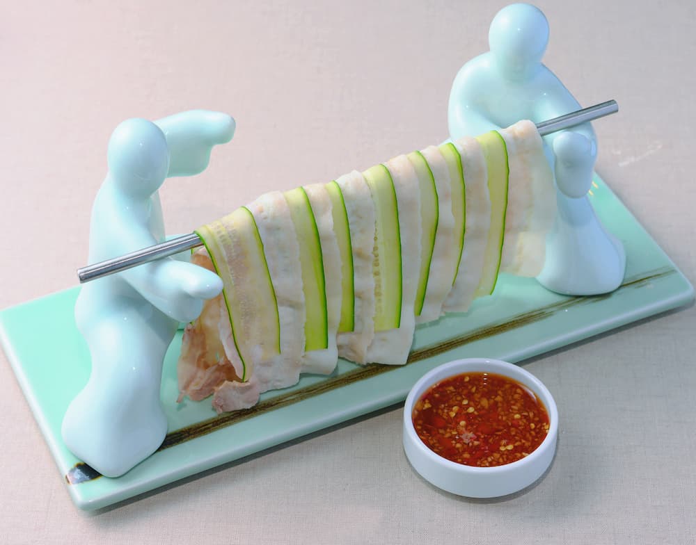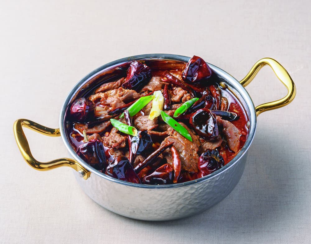其中,《美人茶遇東坡肉》以獨門秘製醬汁搭配紹興老酒慢燉東坡肉,搭配東方美人茶及鹹光餅打造中式漢堡吃法,並附上一杯茶解膩,是柔中帶剛的味覺對話;《YA問晾衣千刀肉》則以手工刀法將豬五花薄切如蟬翼,以衣架懸掛上桌,搭配特調蒜香沾醬,入口即化,技藝與視覺感兼具;《川川川水煮牛》則以三層辣度呈現,由香、麻至辣逐層堆疊,湯底融合花椒與大紅袍,展現麻辣劇場的張力。