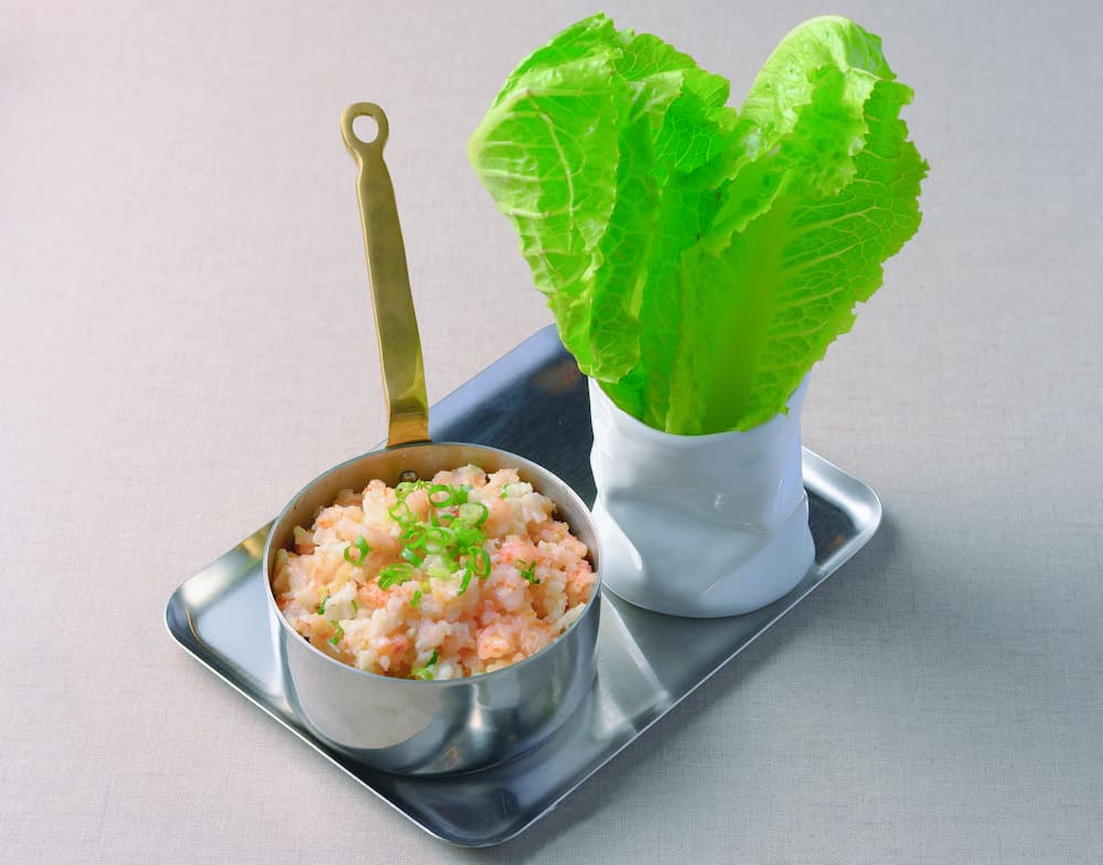 其他菜色同樣充滿戲劇張力:《冠軍絲襪美人腿》(268元),以鹹蛋黃煸炒後高溫爆鍋拋入美人腿(筊白筍),並以絲襪網狀懸掛造型上桌,酥脆口感需趁熱享用;《花雕微醺醉雞》(368元)以冷泡花雕酒低溫浸漬雞腿肉,滑嫩入味;《生菜乾杯蝦鬆》(368元)則加入清脆馬蹄與酥香老油條,包裹生菜入口爽口有層次。