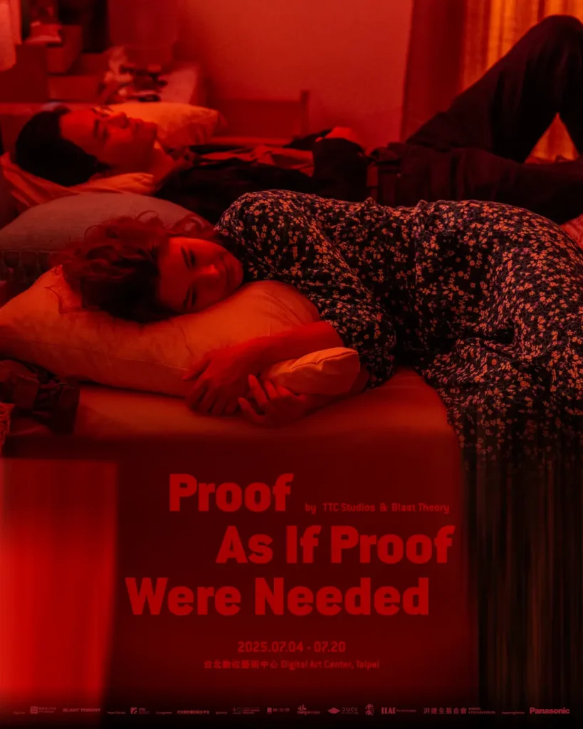 《Proof As If Proof Were Needed》由導演蔡弦剛執導,實力演員夏騰宏與柯念萱主演,背景設定在一間台灣老公寓,文本圍繞著一個在災難中破碎崩解的婚姻故事。但這不單只是一部電影,更是一個互動式、沈浸式的裝置。不過觀眾不需要使用穿戴裝置,而是使用「AI視覺感測系統」(AI Computer Vision System)來體驗。