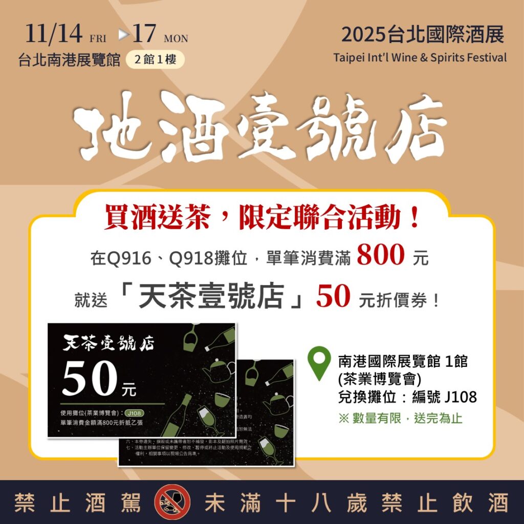 為了鼓勵參觀者在茶與酒之間流動,主辦方推出了「聯合折價券活動」。凡於任一展區(天茶壹號店或地酒壹號店)當日消費滿 800 元,即可獲得另一展區 50 元折價券(每天限量發送)。
