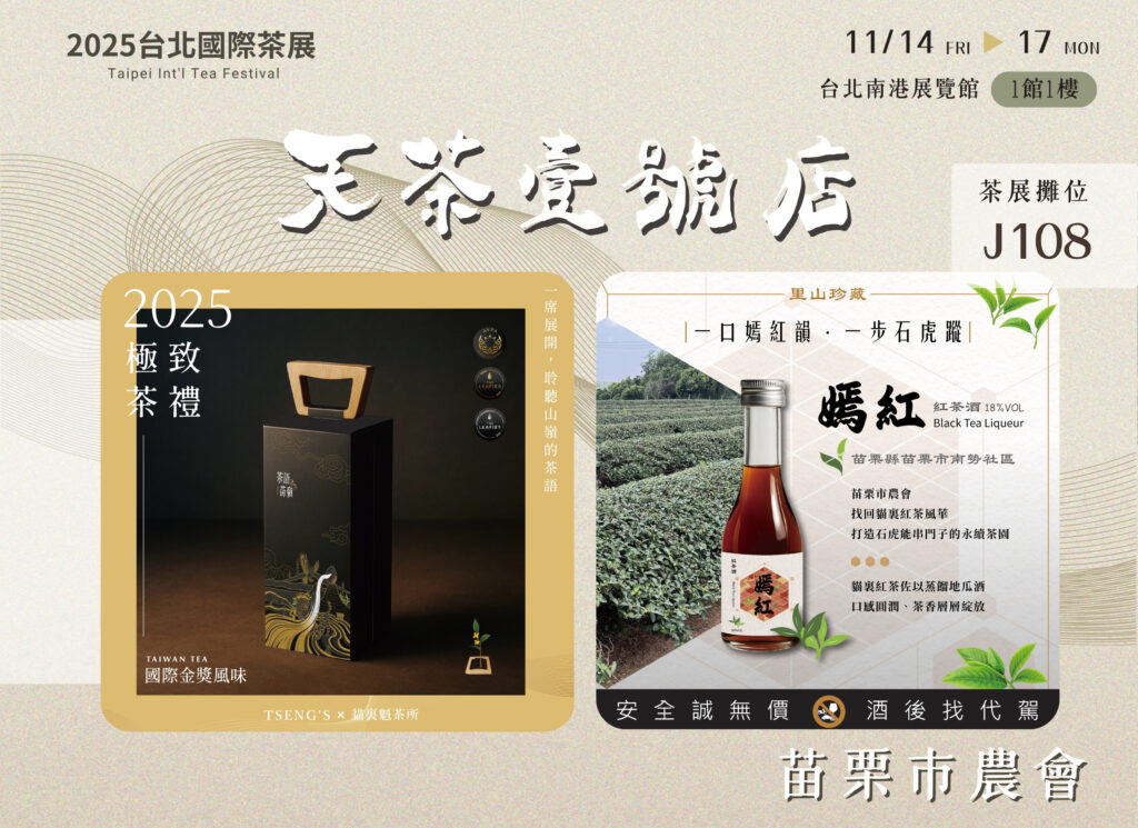 與地酒主題區同步登場的是 1 館的「天茶壹號店」。這是一個集結中部茶業力量的平台,由苗栗縣政府與臺中分署攜手合作,將苗栗縣內具有代表性的茶品搬上國際展場。展出的品牌包括國際比賽大獎茶廠「八甲茶廠」的貓裏紅、TSENG’S 曾的茶(東方美人茶)、日新茶園的酸柑茶,以及三灣金椿茶油工坊的茶油等。